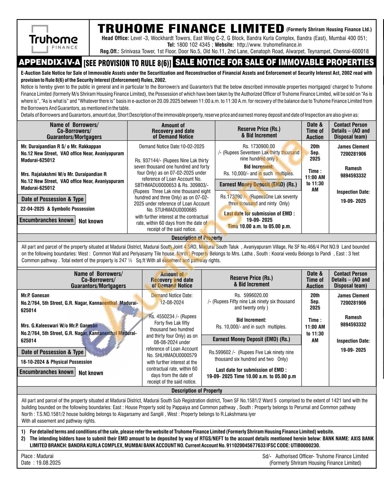 All part and parcel of the property situated at Madurai District, Madurai South Sub Registration district, Town SF No.1581/2 Ward 5 comprised to the extent of 1421 land with the building bounded on the following boundaries: East: House Property sold by Pappaiya and Common pathway, South Property belongs to Perumal and Common pathway North: T.S.NO.1581/2 house building belongs to Alagarsamy and Sangili, West: Property belongs to R.Lakshmana iyer