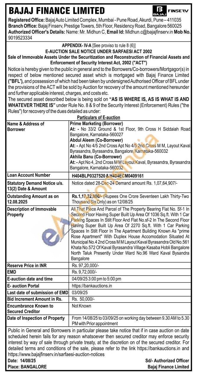 All That Piece And Parcel of The Property Bearing Flat No. Sf-1 In Second Floor Having Super Built Up Area Of 1036 Sq.ft. With 1 Car Parking Spaces In Stilt Floor And Flat No.sf-2 In The Second Floor Having Super Built Up Area Of 2270 Sq.ft. With 1 Car Parking Spaces In Stilt Floor In The Apartment Building Known As "prime Rose Apartment" With Duplex House Accomodation Situated At Municipal No.4 2nd Cross MM Layout Kaval Byrasandra Old No.561 Khata No.572 Of Kaval Byrasandra Village Kasaba Hobli Bangalore North Taluk Presently Under Ward No.96 Ward Kaval Bysandra Bangalore