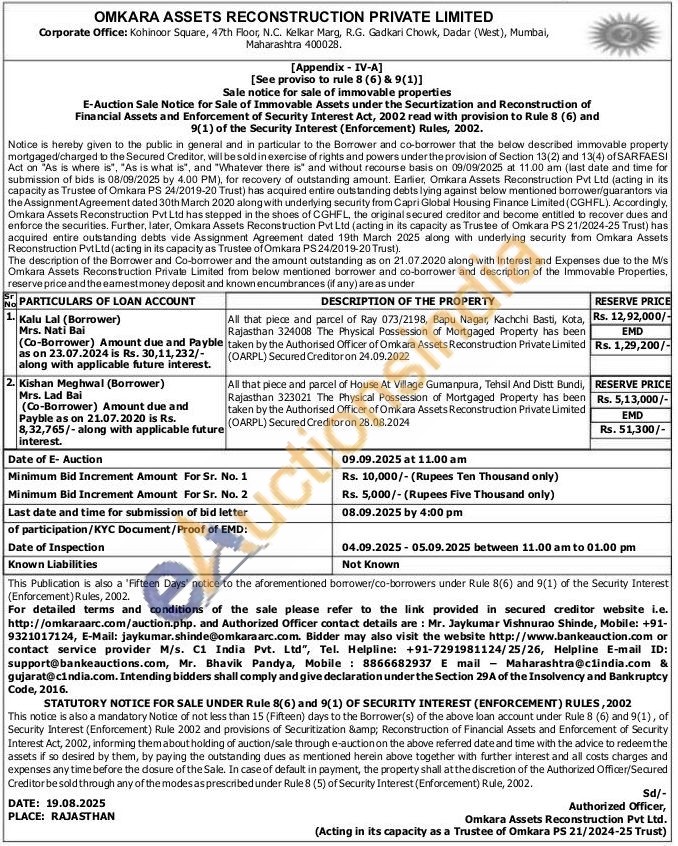 All that piece and parcel of Ray 073/2198, Bapu Nagar, Kachchi Basti, Kota, Rajasthan 324008 The Physical Possession of Mortgaged Property has been taken by the Authorised Officer of Omkara Assets Reconstruction Private Limited (OARPL) Secured Creditor on 24.09.2022