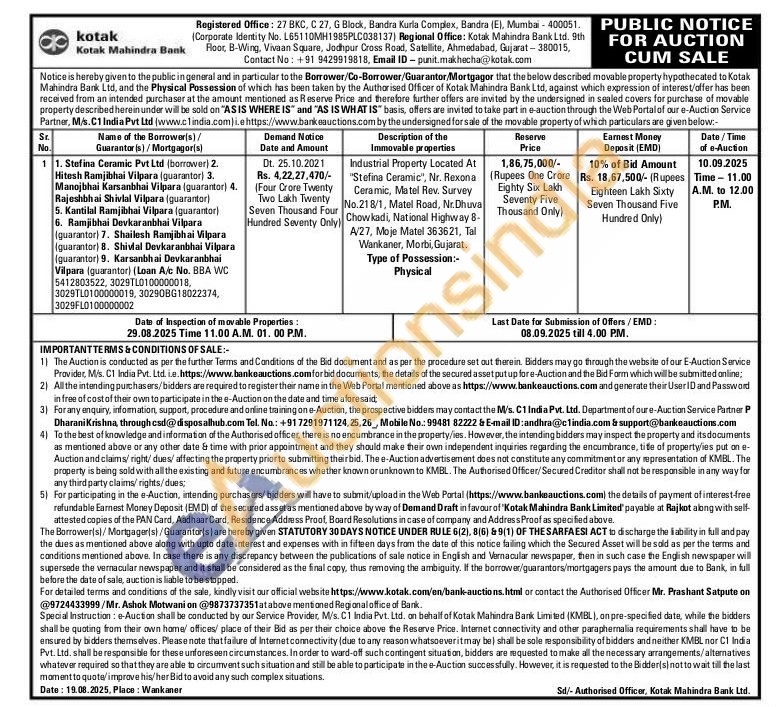 Industrial Property Located At "Stefina Ceramic", Nr. Rexona Ceramic, Matel Rev. Survey No.218/1, Matel Road, Nr. Dhuva Chowkadi, National Highway 8-A/27, Moje Matel 363621, Tal Wankaner, Morbi, Gujarat. Type of Possession:-Physical