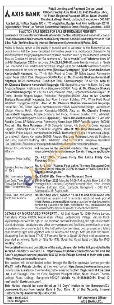 DETAILS OF MORTGAGED PROPERTY: All that House No 1099, Police Layout. Karnataka Police HBCS, Nadanahalli Village Lalitadripura Village. Varuna Hobli, Mysore together with the right to use common areas of the building, the right to use water closet, drainage, lavatories and other conveniences and facilities, amenities in or upon or pertaining to or connected to the flat/unit/office premises, both present and future casementary right and together with all fixtures and fittings, both present and future, Measuring East to West 17+37/2 Feet and North to South 30 Feet and bounded on. Bounded as follows: North by: Site No. 1139, South by: Road, East by: Site No. 1100, West by: Road