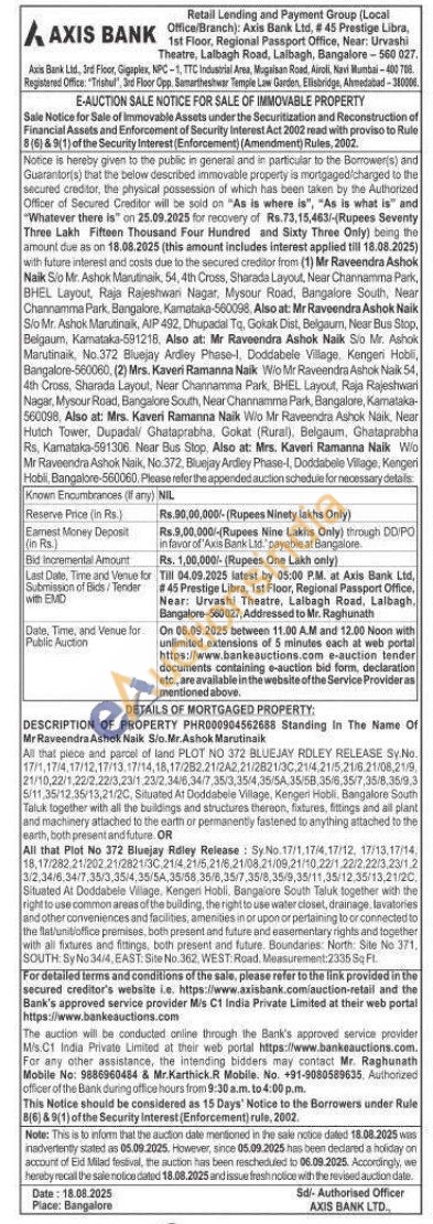 DETAILS OF MORTGAGED PROPERTY: DESCRIPTION OF PROPERTY PHR000904562688 Standing In The Name Of Mr Raveendra Ashok Naik Sio.Mr.Ashok Marutinaik All that piece and parcel of land PLOT NO 372 BLUEJAY RDLEY RELEASE SY.No. 17/1,17/4, 17/12,17/13.17/14,18,17/282.21 242,21/2821/30.21/4,21/5.21/6.21/08,21/9, 21/10.22/1.22/2,22/3,23/1.23/2.34/6,34/7,35/3,35/4,35/5A, 35/58 35/6,35/7,35/8.35/9,3 5/11,35/12.35/13,21/20, Situated At Doddabele Village, Kengen Hobil. Bangalore South Taluk together with all the buildings and structures thereon, fixtures, fittings and all plant and machinery attached to the earth or permanently fastened to anything attached to the earth, both present and future OR All that Plot No 372 Bluejay Rdley Release: Sy No. 17/1,17/4, 17/12, 17/13,17/14 18,17/282 21/202.21/282130 21/4 21/5,21/8.21/08 21/08,21/10.22/1 22/2/22/3 23/12 3/2,34/6.34/7,35/3,35/4,36/54,35/58,35/6,35/7,35/6.35/9,35/11,35/12.35/13.21/20 Situated At Doddabele Village, Kengen Hobili. Bangalore South Taluk together with the right to use common areas of the building, the right to use water closet, drainage, tavatories and other conveniences and facilites, amenities in or upon or pertaining to or connected to the flat/unitioffice premises, both present and future and easementary rights and together with all fixtures and fittings, both present and future. Boundaries: North: Site No 371, SOUTH: SyNo 34/4, EAST: Site No.362, WEST Road. Measurement:2335 Sq Ft.