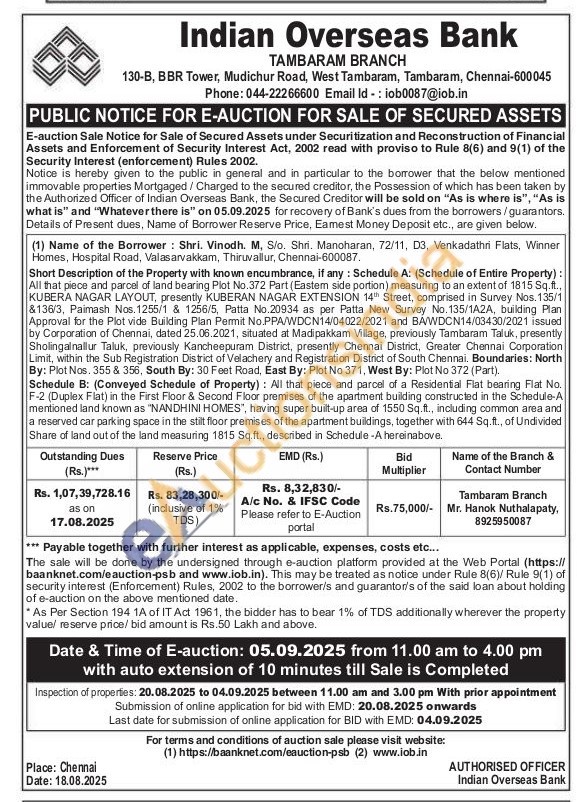 All that piece and parcel of land bearing Plot No.372 Part (Eastem side portion) measuring to an extent of 1815 Sq.ft.. KUBERA NAGAR LAYOUT, presently KUBERAN NAGAR EXTENSION 14th Street, comprised in Survey Nos. 135/1 &136/3, Paimash Nos. 1255/1 & 1256/5, Patta No.20934 as per Patta New Survey No. 135/1A2A, building Plan Approval for the Plot vide Building Plan Permit No.PPA/WDCN14/04022/2021 and BAWDCN14/03430/2021 issued by Corporation of Chennai, dated 25.06.2021, situated at Madipakkam Village, previously Tambaram Taluk, presently Sholingainallur Taluk, previously Kancheepuram District, presently Chennai District, Greater Chennai Corporation Limit, within the Sub Registration District of Velachery and Registration District of South Chennai. Boundaries: North By: Plot Nos. 355 & 356, South By: 30 Feet Road, East By: Plot No 371, West By: Plot No 372 (Part).