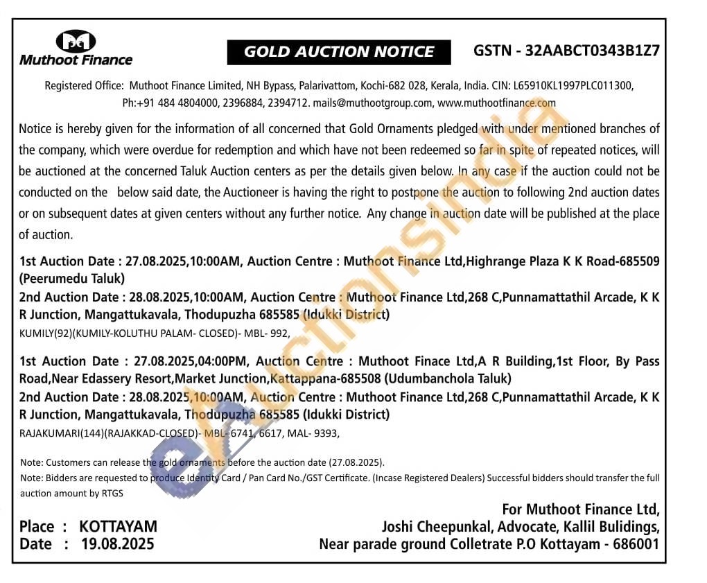 Muthoot Finance Ltd Gold Auctions Auction in Kottayam