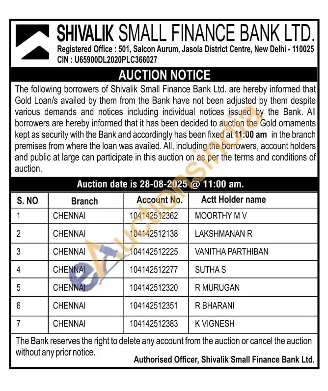 Shivalik Small Finance Bank Ltd Gold Auctions Auction in Chennai