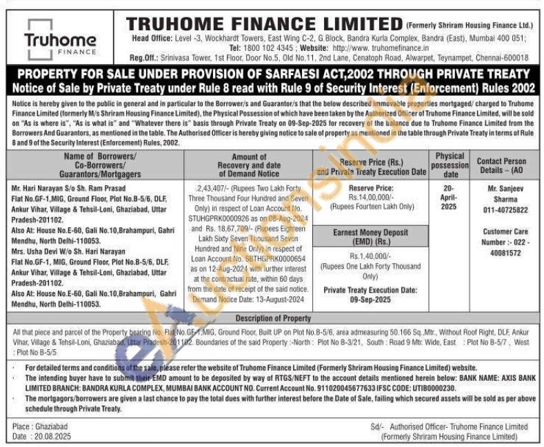 All that piece and parcel of the Property bearing No. Flat No.GF-1,MIG, Ground Floor, Built UP on Plot No.8-5/6, area admeasuring 50.166 Sq., Mtr., Without Roof Right, DLF, Ankur Vihar, Village & Tehsil-Loni, Ghaziabad, Uttar Pradesh-201102. Boundaries of the said Property:-North: Plot No B-3/21, South Road 9 Mtr Wide, East Plot No 8-5/7, West Plot No B-5/5