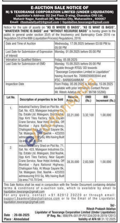Industrial Factory Shed on Plot No. 71, Gat. No. 423, Malegaon Industries Co. Op. Estate Ltd. Malegaon, Dist Nashik, Opp Kirti Tiles Factory, Near Gayatri Crane Service, Near Hotel Ambika, Off Mumbai Agra National Highway, Chalisgaon Fata, At Mouje Sayane Bk. Tal. Malegaon, Dist. Nashik-423203 admeasuring 910 Sq. Mts having Built Up area 710.70 Smt.