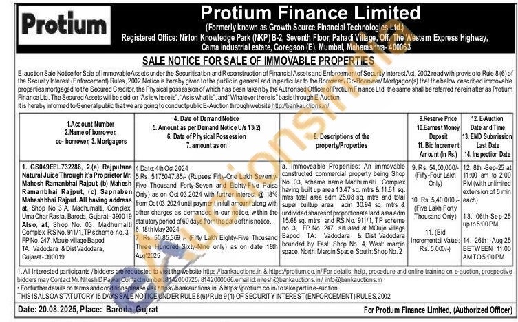 An immovable constructed commercial property being Shop No. 03, scheme name Madhumalti Complex super builtup area adm 30.94 sq. mtrs & mtrs total area adm 25.08 sq. mtrs and tolal undivided shares of proportionate land area adm 15.68 sq. mtrs and RS No. 911/1, TP scherme по. 3. FP No. 247 situated at MOuje village Bapod TA: Vadodara & Dist Vadodara bounded by East: Shop No. 4. West: margin space, North. Margin Space, South. Shop No. 2