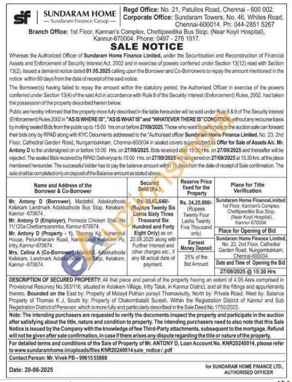 All that piece and parcel of the property having an extent of 4.05 Ares comprised in Provisional Resurvey No.363/116, situated in Kelakam Village, Iritty Taluk, in Kannur District, and all the fittings and appurtenants thereto, Bounded on the East by: Property of Malayil Puthan purayil Thomaskutty, North by: Private Road, West by: Balance Property of Thomas K J. South by: Property of Chakombatalil Suresh. Within the Registration District of Kannur and Sub Registration District of Peravoor, which is more fully and particularly described in the Sale Deed No. 1750/2023