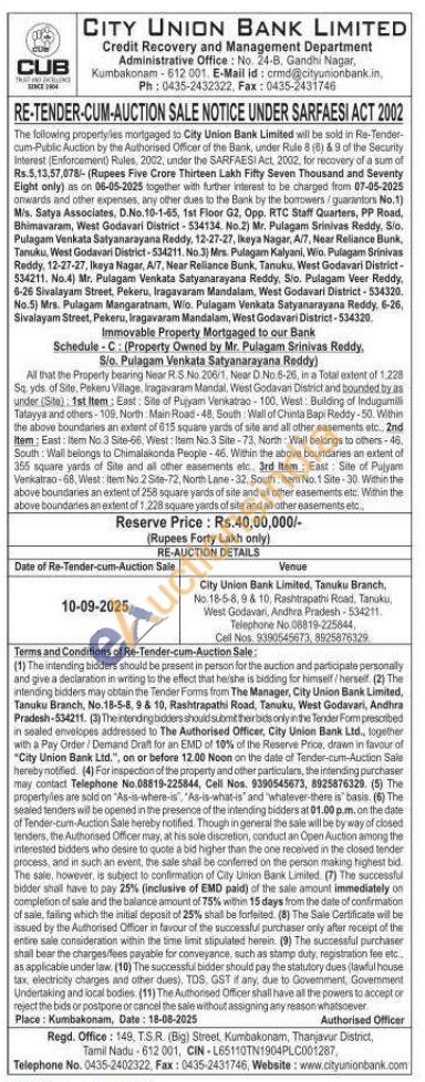 All that the Property bearing Near R.S.No.206/1, Near D.No. 6-26, in a Total extent of 1,228 Sq yds of Site, Pekaru Village, Iragavaram Mandal, West Godavari District and bounded by as under (Site) 1st Item: East: Site of Puyam Venkatrac-100, West: Building of Indugumill Tatayya and others-108, North Main Road-48, South Wall of Chinta Bapi Reddy-50. Within the above boundaries an extent of 615 square yards of site and all other easements etc., 2nd Item: East: Item No.3 Site-66, West: Item No.3 Site-73, North Wall belongs to others-46. South Wall belongs to Chimalakonda People-46. Within the above boundaries an extent of 355 square yards of Site and all other easements etc.. 3rd Item: East: Site of Pujyam Venkatran-68, West: Item No.2 Site-72, North Lane-32. South Item No.1 Site-30. Within the above boundaries an extent of 258 square yards of site and all other easements etc. Within the above boundaries an extent of 1.228 square yards of site and all other easements etc..