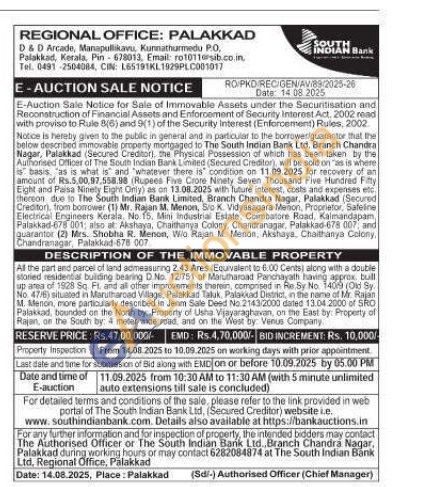 All the part and parcel of land admeasuring 2.43 Ares (Equivalent to 6.00 Cents) along with a double storied residential building bearing D.No. 12:751 of Marutharoad Panchayath having approx. bull up area of 19:28 Sq. Ft. and all other improvements therein, comprised in Re Sy No. 1409 10 Sy No. 47/6) situated in Marutharoad Village, Palakkad Taluk, Palakkad Distinct, in the name of Mr. Rajan M. Menon, mone particularly desorbed in Jenm Sale Desd No. 2143/2000 dated 13.04.2000 of SRO Palakkad, bounded on the North by Property of Usha Vijayaraghavan, on the East by: Property of Rajan, on the South by: 4 meter wide road and on the West by Venus Company