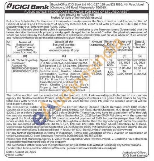Open Land Near Door. No. 25-16-222. In D. No. 178/C/1/A, Admeasuring 254-8/9 Sq.yds or 213-12 Sq.mtrs, Situated ot Ankireddypalem. Nallapadu Subdivision, Guntur Municipal Corporation, Guntur District and bounded by East: joint Passage Limit 30 Ft 6 inches South: Maddhu Tirupathamma's Land limit 67 Ft West: Challa Chalapathi Roo's Property limit 38Ft-6 inches North: Yebbiri Meeraiah's land limit 66Feet