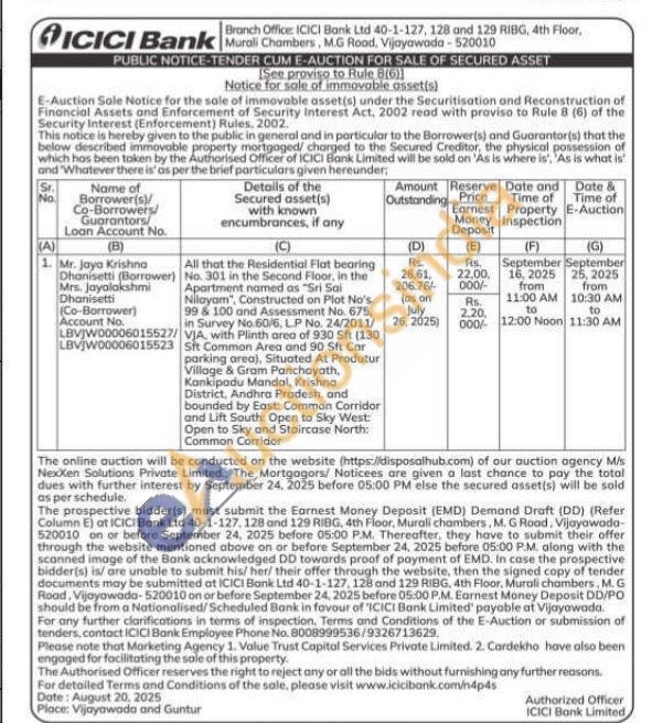 All that the Residential Flat bearing No. 301 in the Second Floor, in the Apartment named as "Sri Sai Nilayam", Constructed on Plot No's. 99 & 100 and Assessment No. 675, in Survey No.60/6, LP No. 24/2011/VJA, with Plinth area of 930 Sft (130 Sft Common Area and 90 Sft Cor parking area), Situated At Produtur Village & Gram Panchayath, Kankipadu Mandal, Krishna District, Andhra Pradesh, and bounded by East: Common Corridor and Lift South: Open to Sky West: Open to Sky and Staircase North: Common Corridor