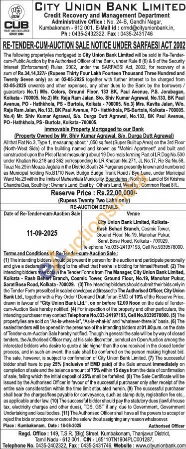 All that Fiat No.3, Type 1, measuring about 1,050 sq.feet (Super Built up Area) on the 3rd Floor (North-West Side) of the building named and known as "Mohini Apartment and built and constructed upon the Plot of land measuring about 19 Decimals forming Part of LR Dag No.530 under Khatian No.218 and 362 corresponding to LR Khatian No.271, JL No.17, Re Sa No.58, Touzi No.29 in Mouza Jagtala in the District South 24 Parganas presently known and numbered as Municipal holding No.B1/10 New, Budge Budge Trunk Road /Bye Lane, under Municipal Ward No.29 within the limits of Maheshtala Municipiity. Boundaries: North by: Land of Sri Krishna Chandra Das, South by: Owner's Land, East by: Other's Land, West by: Common Road 8 ft...