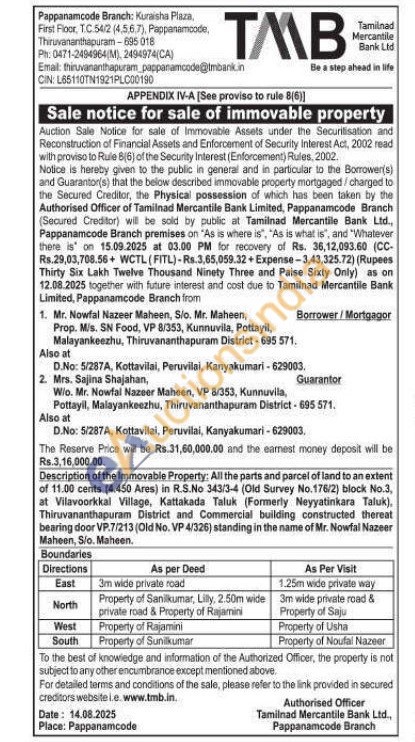 Description of the Immovable Property: All the parts and parcel of land to an extent of 11.00 cents (4.450 Ares) in R.S.No 343/3-4 (Old Survey No.176/2) block No.3, at Vilavoorkkal Village, Kattakada Taluk (Formerly Neyyatinkara Taluk), Thiruvananthapuram District and Commercial building constructed thereat bearing door VP.7/213 (Old No. VP 4/326) standing in the name of Mr. Nowfal Nazeer Maheen, S/o. Maheen. Boundaries Directions As per Deed As Per Visit East 3m wide private road 1.25m wide private way North Property of Sanilkumar, Lily, 2.50m wide private road & Property of Rajanini 3m wide private road & Property of Saju West Property of Rajamini Property of Usha South Property of Sunilkumar Property of Noufal Nazeer