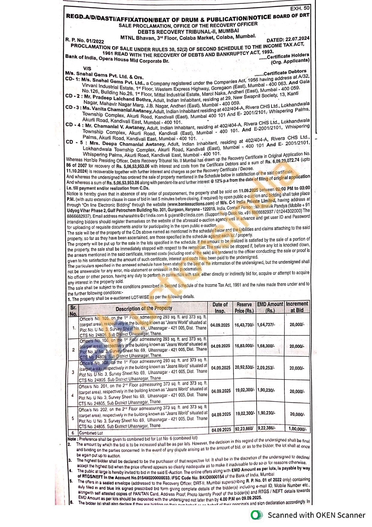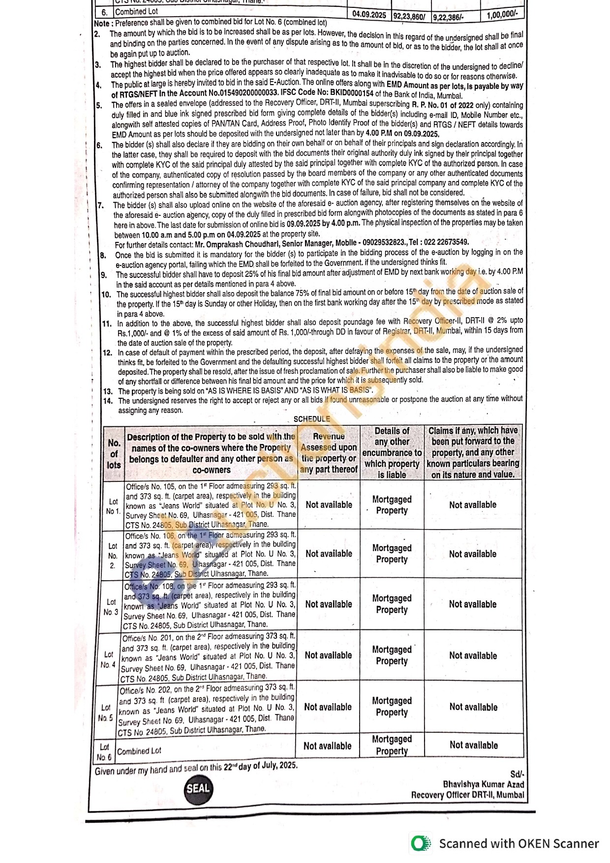 Office/s No. 201, on the 2nd Floor admeasuring 373 sq. ft. and 373 sq. ft. (carpet area), respectively in the building known as "Jeans World" situated at Plot No. U No. 3, Survey Sheet No. 69. Ulhasnagar 421 005, Dist. Thane CTS No 24805, Sub District Ulhasnagar, Thane