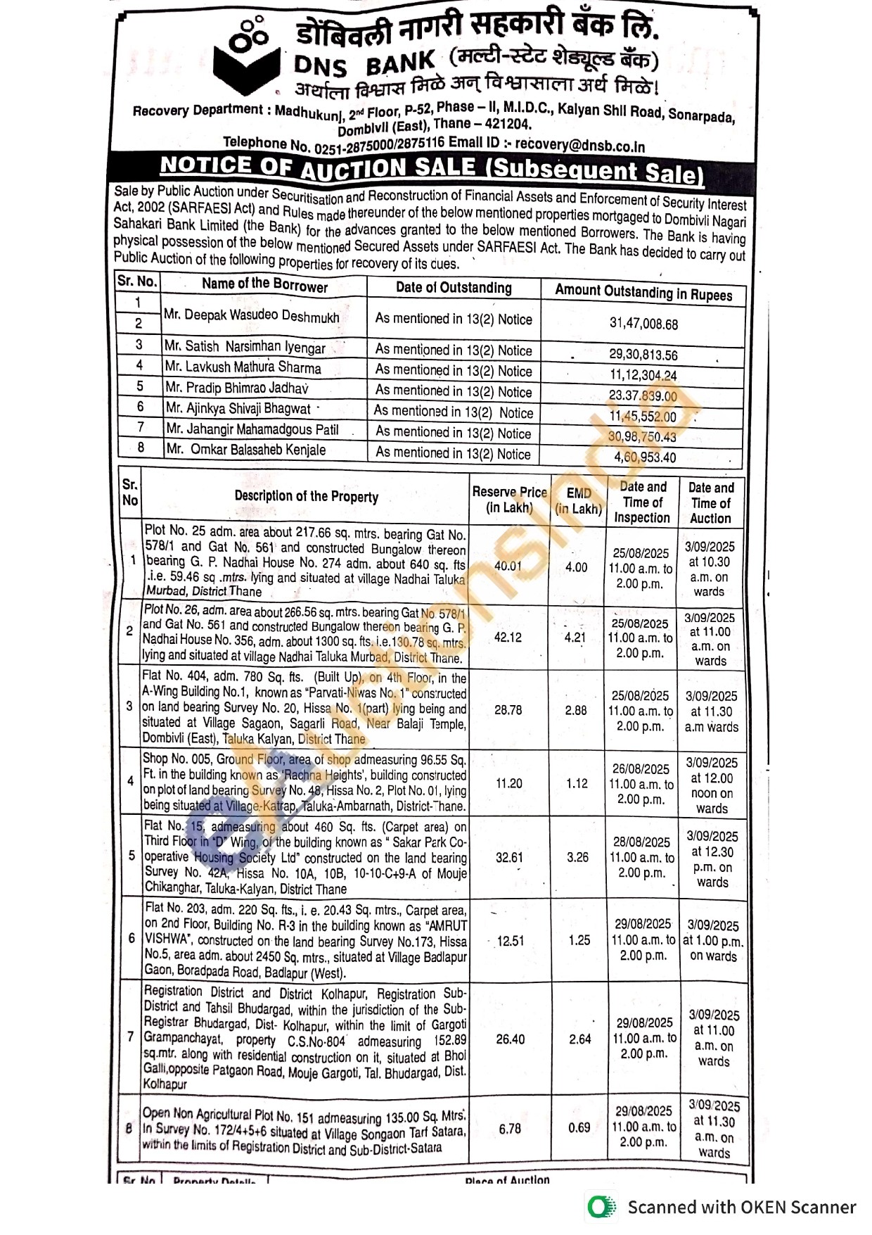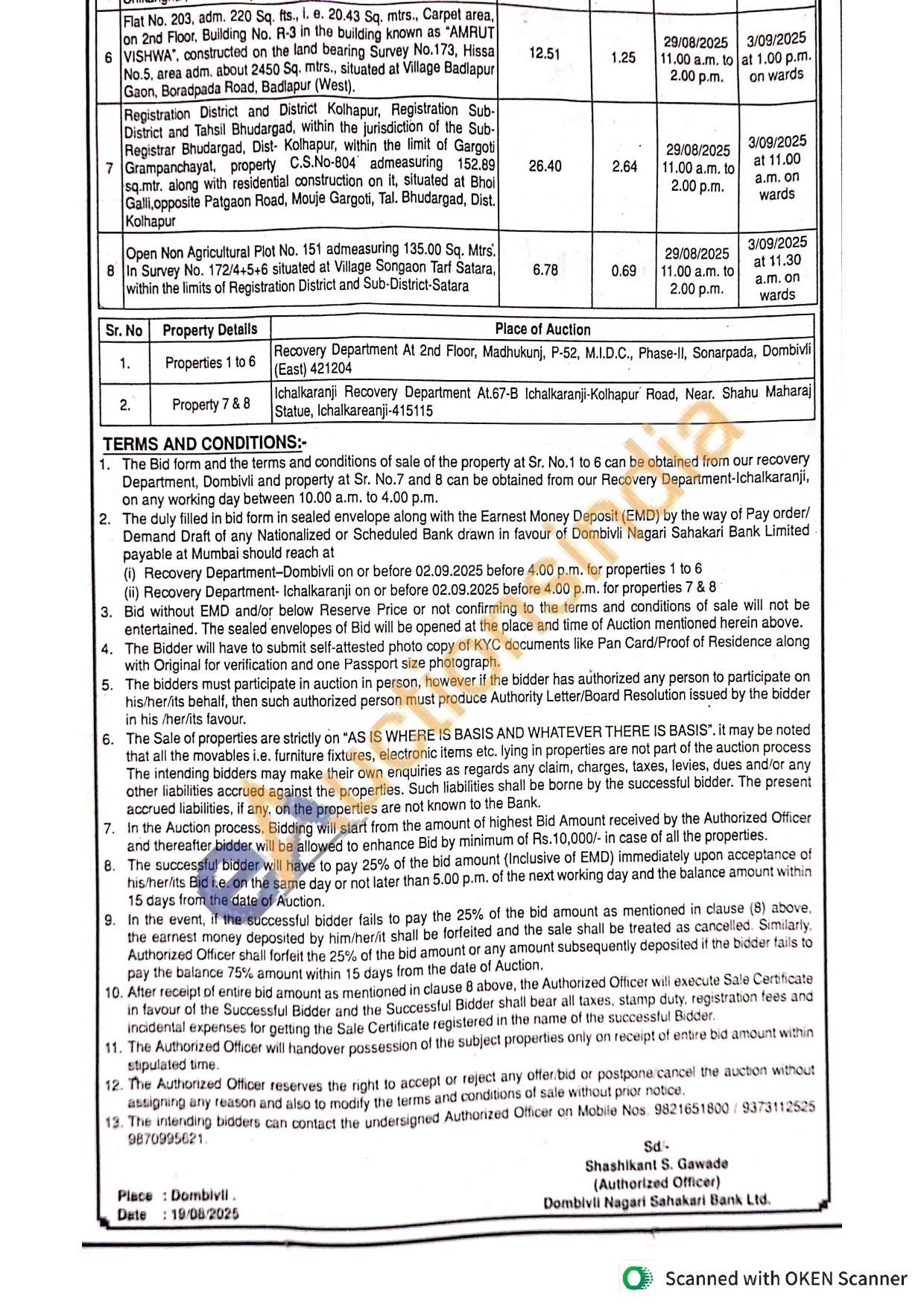 Contact Authorized Officer on Mobile Nos. 9821651800/9373112525 9870995621.