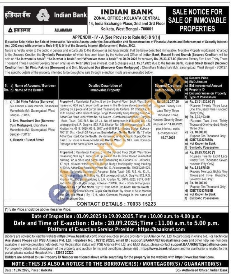 Property-1: Residential Flat No. B on the Second Floor (South West Side) measuring 606 sq.ft. super built up area in the G+three storied residential building on a piece and parcel land measuring 09 Cottahs, 07 Chittacks, 17 sq.ft. situated within limits of Budge Budge Municipality being Holding N-49/1/A Adhar Das Road under Ward No. 13, Mouza Garbhukta Nandanpur, Pargana Balia, Touzi-353, R.S. No. 33 J.L. No. 08 comprised in R.S. Dag No. 433 corresponding L.R. Dag No. 572, R.S. Khaitan No. 356 comesponding to L.R. Khaitan No. 6618, 6620, 6619, 6617 and 6616 P.S. Budge Budge, Kolkata 700137, Dist.-South 24 Parganas. Bounded by: On the North: By 13 wide Adhar Das Road: On the South: By Remaining land of Chumki Gupta: On the East: By House of Aloke Mondal and On the West: By 10 ft. wide Common Passage in the name of Smt. Moushumi Das.