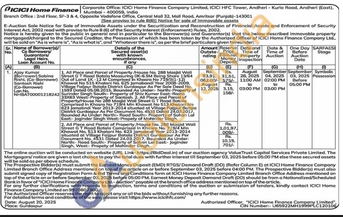 1. All Piece and Parcel of Property/House No. 288 Masjid Wali Street GT Road Batala Measuring OK-6.5M Being Share 13/64 Out of Land 1K-12 M Comprised In Khasra No 719/3(1-12) Khawat No 515 Khatoni No. 625 jamabandi Year 2008-2009, Village Faijpur Batala District Gurdaspur As Per Sale Deed No. Surinder Singh South: Property of Shiv Kumar East:-Rasto 1593 Dated 05.08.2015. Bounded As Under: North: Property of 33X63 West-Property of Santosh. 2. All Piece and Parcel of Property/House No 288 Masjid Wall Street GT Road Batola Comprised In Khasra No 719/4 Min Khawat No 513 Khatoni No 623 Jamabndi Year 2013-2014 situated at Village Faijpur Batala District Gurdaspur As Per Document No. 4531 Dated 24.03.2017, Bounded As Under: North:- Road South: Property o of Sohan East:- Joginder Singh West-Propety of Mohinder Singh. Lal