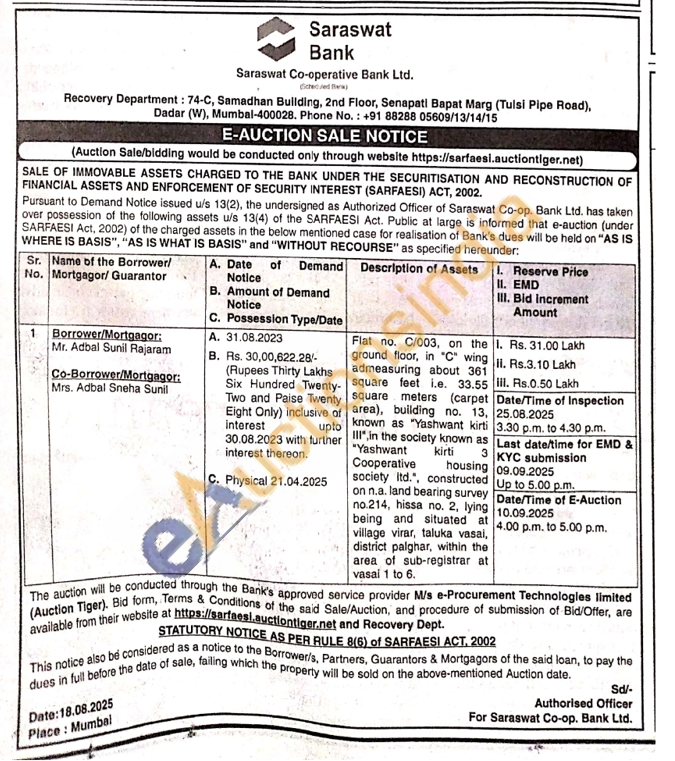 Flat no. C/003, on the ground floor, in "C" wing admeasuring about 361 square feet i.e. 33.55 square meters (carpet area), building no. 13, known as "Yashwant kirti III", in the society known as "Yashwant kirti 3 Cooperative housing society Itd.", constructed on n.a. land bearing survey no.214, hissa no. 2, lying being and situated at village virar, taluka vasai, district palghar, within the area of sub-registrar at vasai 1 to 6.