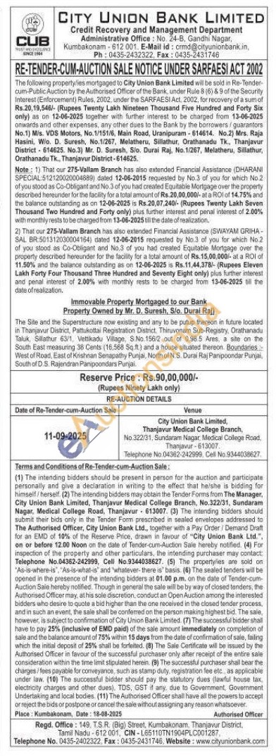 Immovable Property Mortgaged to our Bank Property Owned by Mr. D. Suresh, S/o. Durai Raj) The Site and the Superstructure now existing and any to be putup thereon in future located In Thanjavur District, Pattukottai Registration District, Thiruvonam Sub-Registry, Orathanada Taluk, Silattur 63/1, Vettikadu Village, S No.1562 out of 0.98.5 Ares, a site on the South East measuring 38 Cents (16,568 Sq.ft) and a house situated thereon. Boundaries West of Road. East of Krishnan Senapathy Punjai, North of N S. Dural Raj Panipoondar Punjai South of D.S. Rajendran Panpoondas Punjal