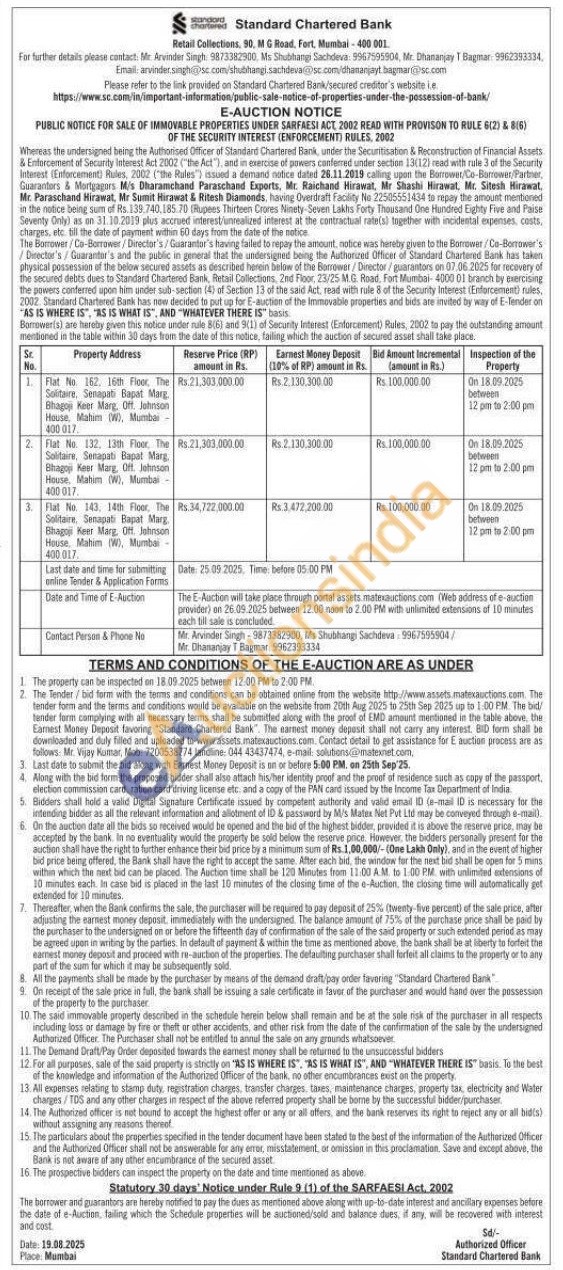 Flat No. 143, 14th Floor, The Solitaire, Senapati Bapat Marg. Bhagoji Keer Marg, Off. Johnson House, Mahim (W), Mumbai 400.017.