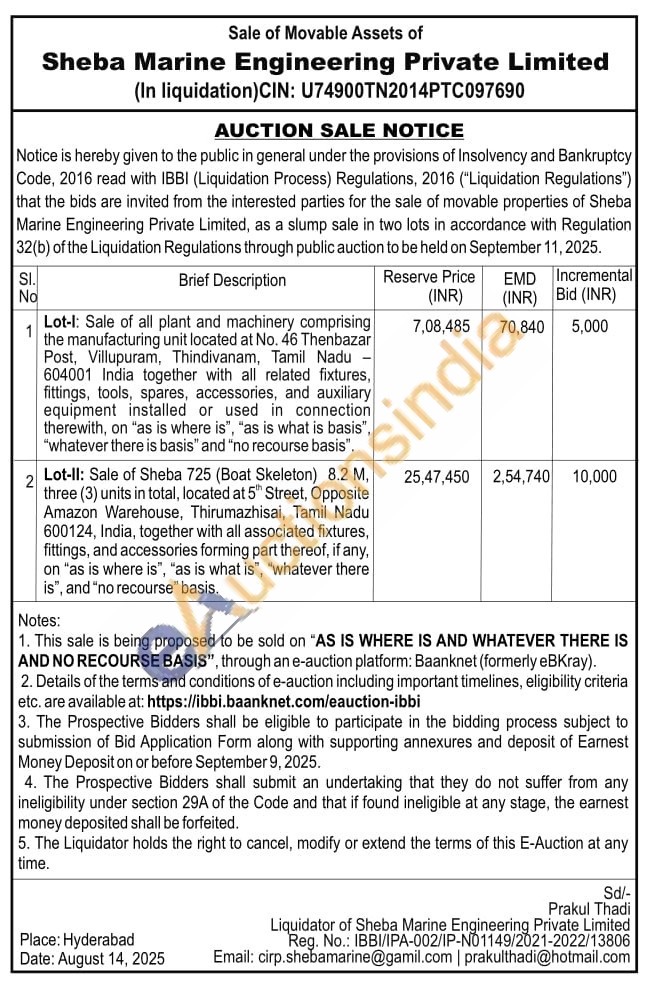 Lot-l: Sale of all plant and machinery comprising the manufacturing unit located at No. 46 Thenbazar Post, Villupuram, Thindivanam, Tamil Nadu 604001 India together with all related fixtures, fittings, tools, spares, accessories, and auxiliary equipment installed or used in connection therewith, on "as is where is", "as is what is basis", "whatever there is basis" and "no recourse basis".