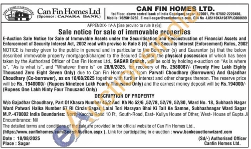 W/o Gajadhar Choudhary, Part Of Khasra Number 45/2 And Kh No 52/6,52/78, 52/79, 52/80, Ward No. 18, Subhash Nagar Ward Patwari Halka Number 67 RI Circle Sagar, Lalai Tori Narayan Bhai Ki Tall Ke Samne, Subhashnagar Ward Sagar M.P.-470002 India Boundaries: North-Kaccha Road 10 Ft. South-Road, East- Kuliya House of Other, West-House of Gupta Ji Encumbrance: Nil