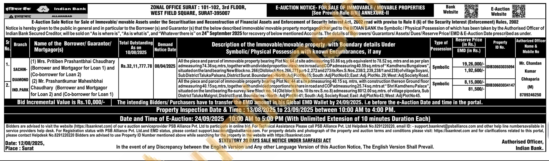 1) All the piece and parcel of immovable property bearing Plot No: 64 at site admeasuring 93.86 sq.yds equivalent to 78.52 sq. mtrs and as per plan admeasuring 74.36sq.mtrs, together with undivided proportionate share in road and COPadmeasuring 40.59 sq.mtrs of" Kamdhenu Bungalows", situated on the land bearing New Block no. 266 (Oldblock Nos. 266,271 part-2, 272 and 273 its Rev. S.Nos.238/2, 239, 238/1 and 238) of village Soyani, Sub District Taluka Palsana, District Surat. Boundaries:-North: Adj Plot No 65; South: Adj Plot No 63; East: Adj. Plot No.29; West: Adj Society Road
