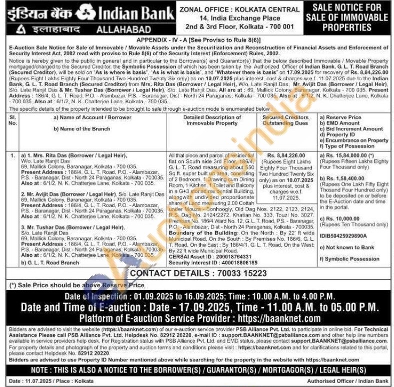 All that piece and parcel of residential flat on South side 3rd Floor, 186/4. G. L. T. Road measuring about 550 Sq.ft. super built up area, consisting of 2 Bedroom, 1 Drawing cum Dining Room, 1 Kitchen, 1 Toilet and Balcony in a G+3 storied residential Building, alongwith undivided proportionate share of Land measuring 2.00 Cottah under Mouza - Bonhoogly, Old Dag Nos. 2122, 2123, 2124, R.S. Dag No. 2124/2272, Khatian No. 333, Touzi No. 3027 Premises No. 186/4 Ward No. 12. G.LT. Road, P.S. Baranagar, PO-Alambazar, Dist-North 24 Paraganas, Kolkata - 700035 Boundary of the Building: On the North By 22' ft wide Municipal Road, On the South By Premises No. 186/6, G. L T. Road, On the East: By 186/4/1, G. L. T. Road, On the West By 22'ft wide Municipal Road. CERSAL Asset ID: 200018764331
