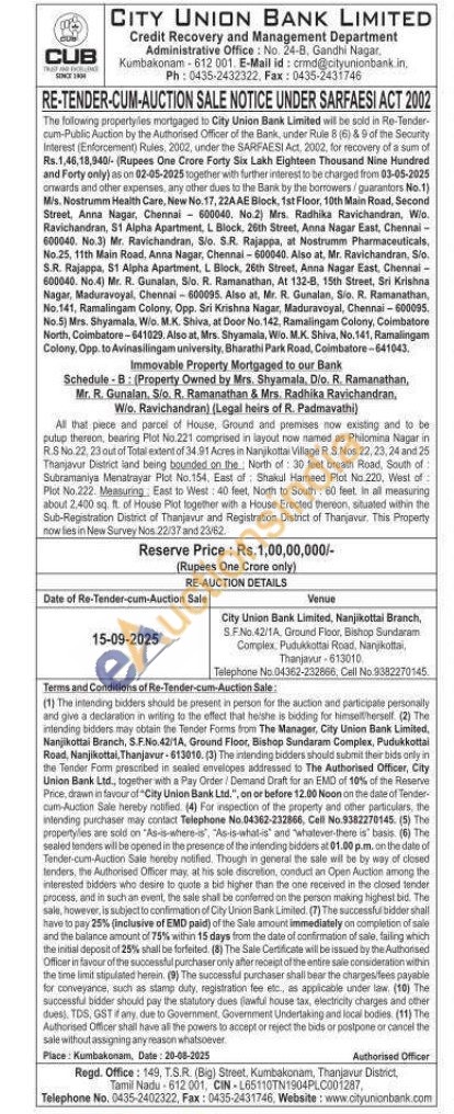 All that piece and parcel of House, Ground and premises now existing and to be putup thereon, bearing Plot No.221 comprised in layout now named as Philomina Nagar in R.S No. 22, 23 out of Total extent of 34,91 Acres in Nanjikottai Village R.S.Nos 22. 23. 24 and 25 Thanjavur District land being bounded on the North of: 30 feet breath Road, South of Subramaniya Menatrayar Plot No.154, East of Shakul Hameed Plot No 220, West of Piut No.222. Measuring East to West 40 feet, North to South: 60 feet in all measuring about 2.400 sq. ft. of House Plot together with a House Erected thereon, situated within the Sub-Registration District of Thanjavur and Registration District of Thanjavur. This Property now lies in New Survey Nos 22/37 and 23/62