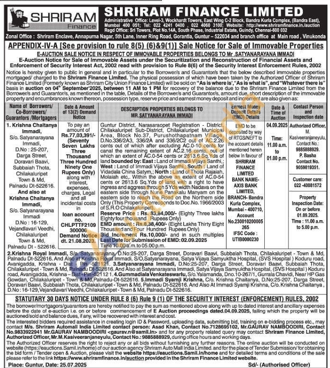 Guntur District, Narasaraopet Registration District, Chilakaluripet Sub-District, Chilakaluripet Municipal Area, Block No.37, Purushothapatnam Village, D.No.336/2A3, 336/2A and 336/2C2 out of AC.2.26 cents out of which after excluding AC.0-10 cents for canal the remaining extent of AC.2.16 cents, out of which an extent of AC.0-54 cents or 2613.6 Sq. Yds of land bounded by: East: Land of Immadi Vijaya Santhi,; West: Land of Immadi Vijaya Santhi,; South: Land of Vidadala China Satym, North: Land of Thota Rajaiah, Molaiah etc,. Within the above an extent of AC.0-54 cents or 2613.6 Sq. Yds of land with a right to have ingress and aggress through 5 Yds width Nadava on the eastern side through Nune Panakalu Manyam on the eastern side to reach the Road on the Northern side Only (This Property Corresponds to Doc. No. 1966/2003 of S.R.O Chilakaluripet).