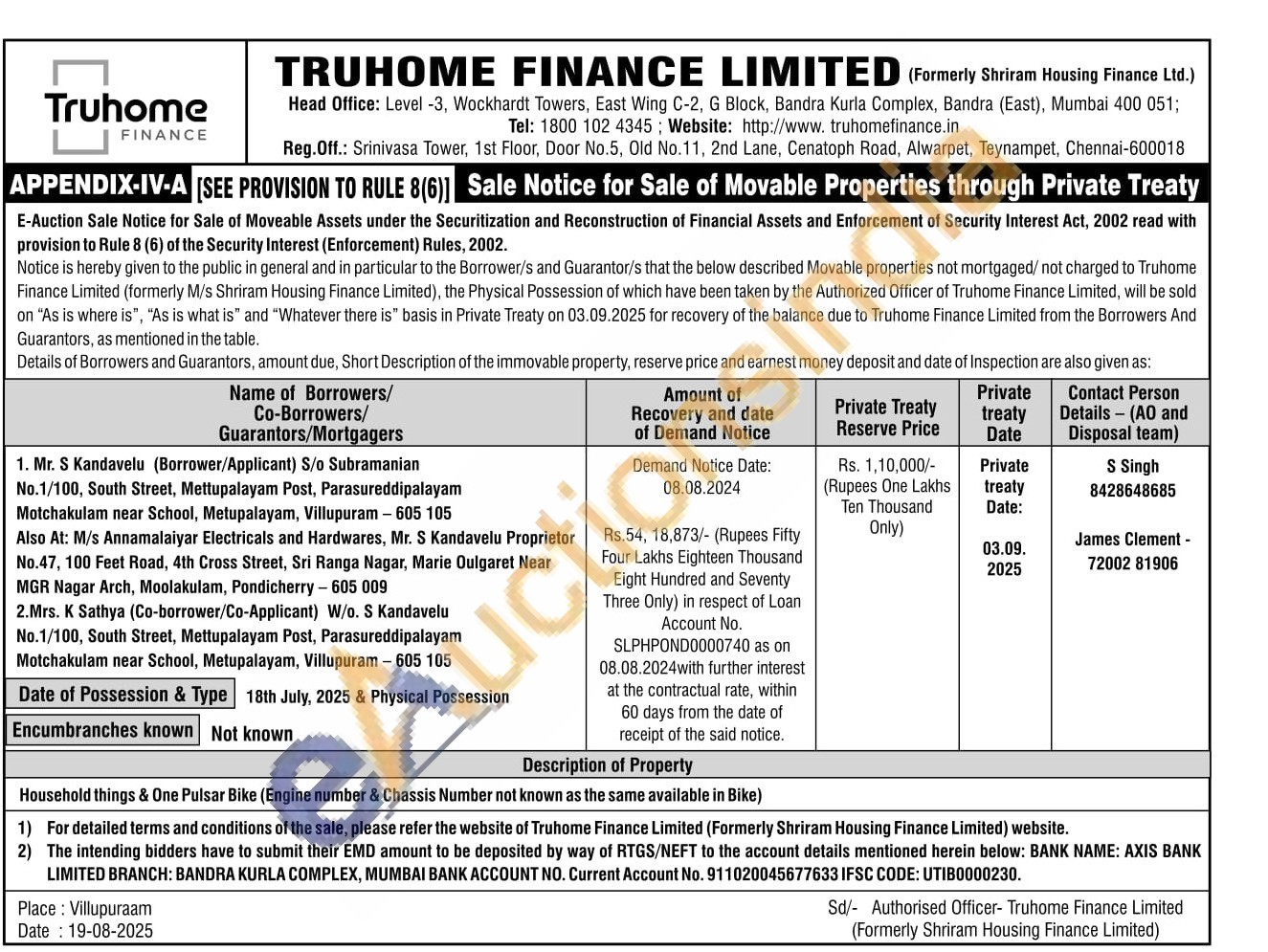 Household things & One Pulsar Bike (Engine number & Chassis Number not known as the same available in Bike)