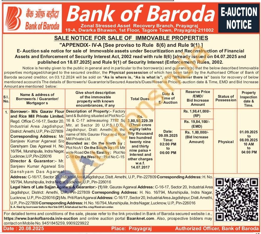 Factory land & Building situated at Plot No C-16 & C-17 admeasuring 7782 Sq Mtr, at Sector 20 U.P.S.I.D.C.. Jagdishpur, Distt: Amethi in the name of M/s Gaurav Flour and Rice Mill Private Ltd. Bounded as: On the North by: Plot NoA1 On the South by: 18 Mtr wide Road On the East by: Plot No C-18 On the West by: Plot No C-15