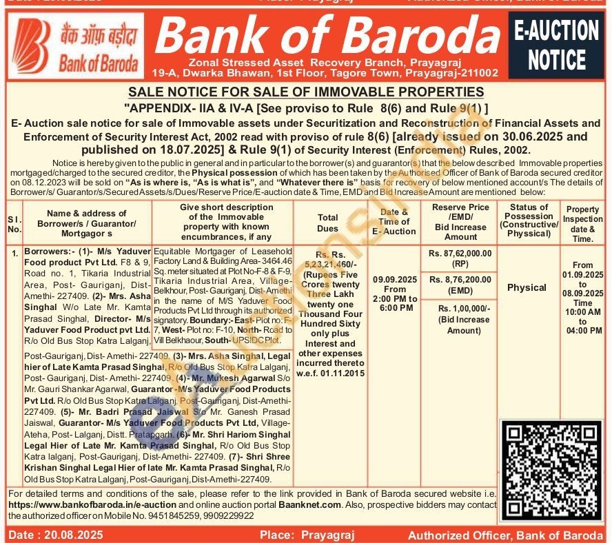 Equitable Mortgager of Leasehold Factory Land & Building Area-3464.46 Sq. meter situated at Plot No-F-8 & F-9, Tikaria Industrial Area, Village-Belkhour, Post-Gauriganj, Dist-Amethi in the name of M/S Yaduver Food Products Pvt Ltd through its authorized signatory. Boundary:- East-Plot no: F-7, West- Plot no: F-10, North- Road to Vill Belkhaour, South-UPSIDC Plot.