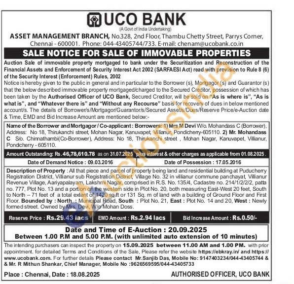 Description of Property: All that piece and parcel of property being land and residential building at Puducherry Registration District, Villianur sub Registration District, Village No. 32 in villianur commune panchayat, Villianur Revenue Village, Aariyapalayam, Lakshmi Nagar, comprised in R.S. No. 135/4, Cadastre no. 214/1/2/2/2, patta no. 777, Plot No. 13 and a portion on the western side in Plot No. 20, both measuring East-West 20 feet, South to North-71 feet of a total extent of 1420 sq.ft or 131 Sq. m of land with a building of Ground Floor and First Floor. Bounded by: North: Municipal Road, South Plot No. 21, East: Plot No. 14 and 20, West: Newly formed street. Owned by Mrs. Devi, W/o Mohan Doss.
