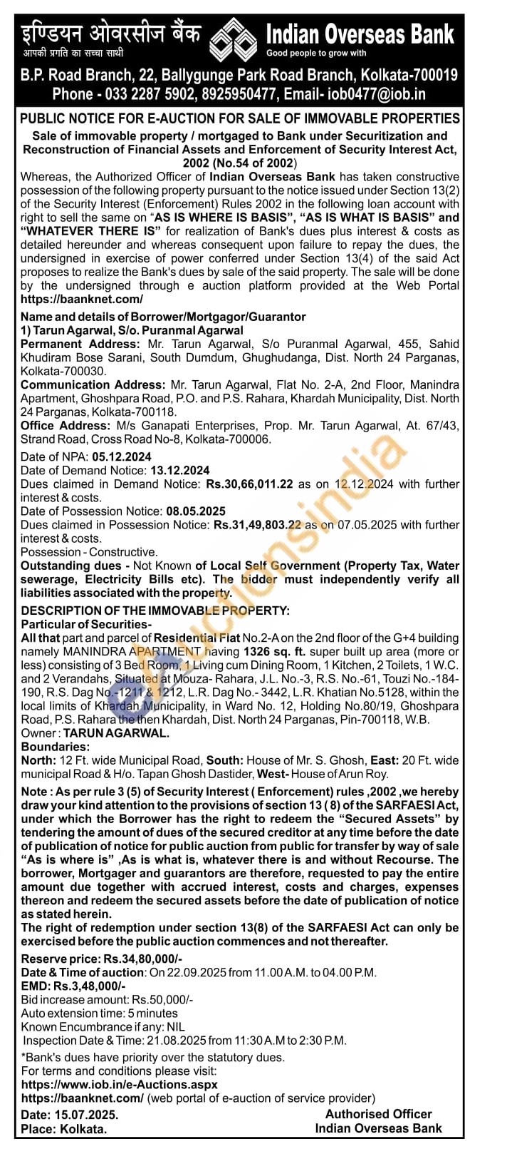 All that part and parcel of Residential Flat No.2-A on the 2nd floor of the G+4 building namely MANINDRA APARTMENT having 1326 sq. ft. super built up area (more or less) consisting of 3 Bed Room, 1 Living cum Dining Room, 1 Kitchen, 2 Toilets, 1 W.C. and 2 Verandahs, Situated at Mouza- Rahara, J.L. No.-3, R.S. No.-61, Touzi No.-184-190. R.S. Dag No.-1211 & 1212, L.R. Dag No.-3442, L.R. Khatian No.5128, within the local limits of Khardah Municipality, in Ward No. 12, Holding No.80/19, Ghoshpara Road, P.S. Rahara the then Khardah, Dist. North 24 Parganas, Pin-700118, W.B. Owner: TARUN AGARWAL.