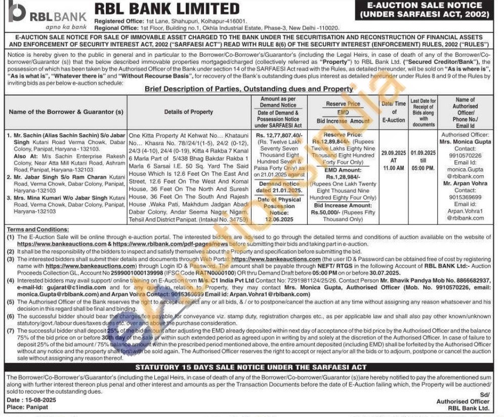 contact Mrs. Monica Gupta, Authorised Officer (Mob. No. 9910570226