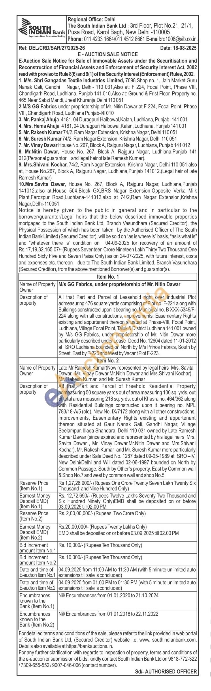 Ad that Part and Parcel of Leasehold right over Industrial Pict admeasuring 476 square yards comprising of Plist no F-224 along with Buildings constructed upon it bearing no. Municipal no. 8 XXX-5349/F 224 along with all constructions, improvements, Easementary Righte existing and appurtenant Phereon situated at Phine-VIII, Focal Point Luchiana, Vilage Focal Point, Talck & District Ludhiana 141-001 owned by Mis GB Fabrics, under proprietorship of Mr. Nitin Dawar more particularty described under Lease Deed No. 12604 dated 11-01-2012 at SRO Ludhiana bounded on North by Mis Prince Fabrics, South try Street, East by F-225 and West by Vacant Plot F-223