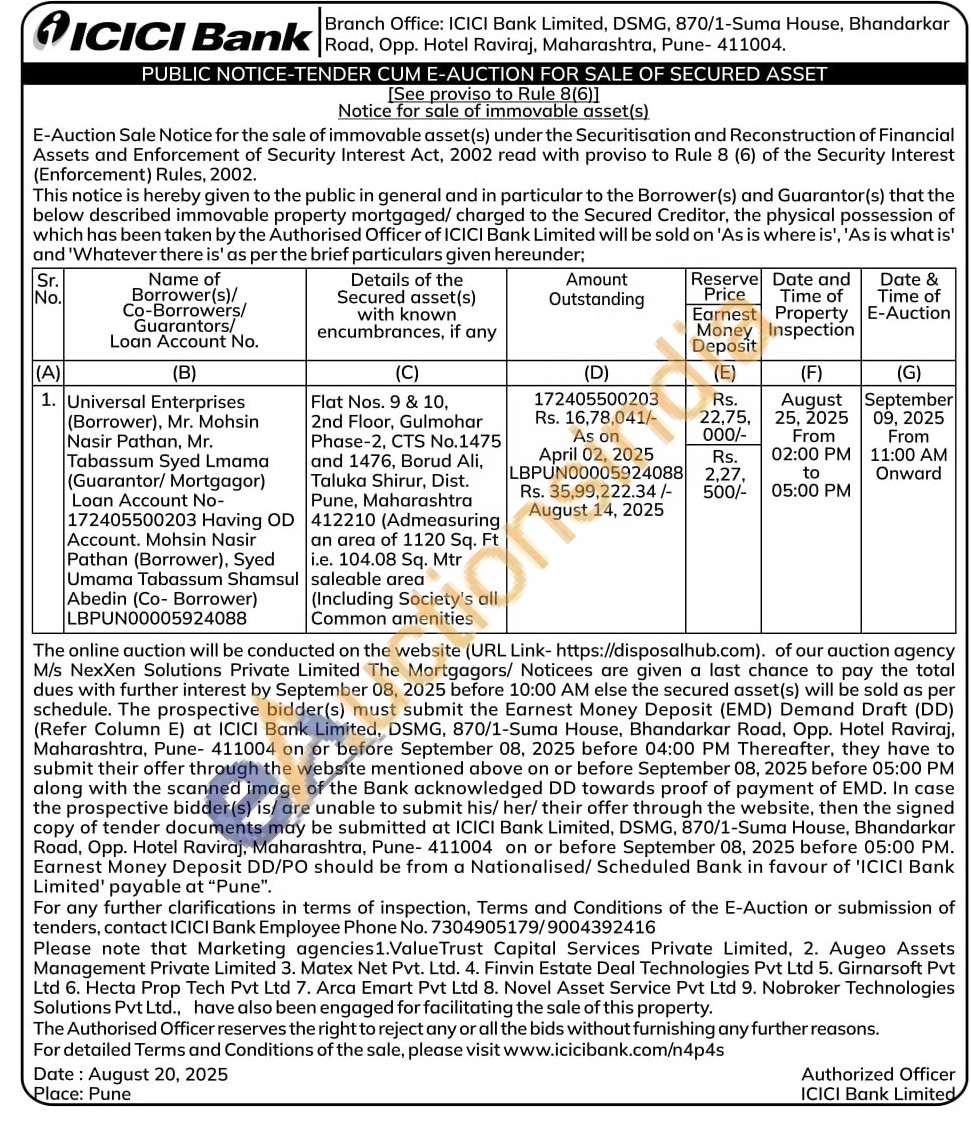 Flat Nos. 9 & 10, 2nd Floor, Gulmohar Phase-2, CTS No.1475 and 1476, Borud Ali, Taluka Shirur, Dist. Pune, Maharashtra 412210 (Admeasuring an area of 1120 Sq. Ft i.e. 104.08 Sq. Mtr saleable area (Including Society's all Common amenities