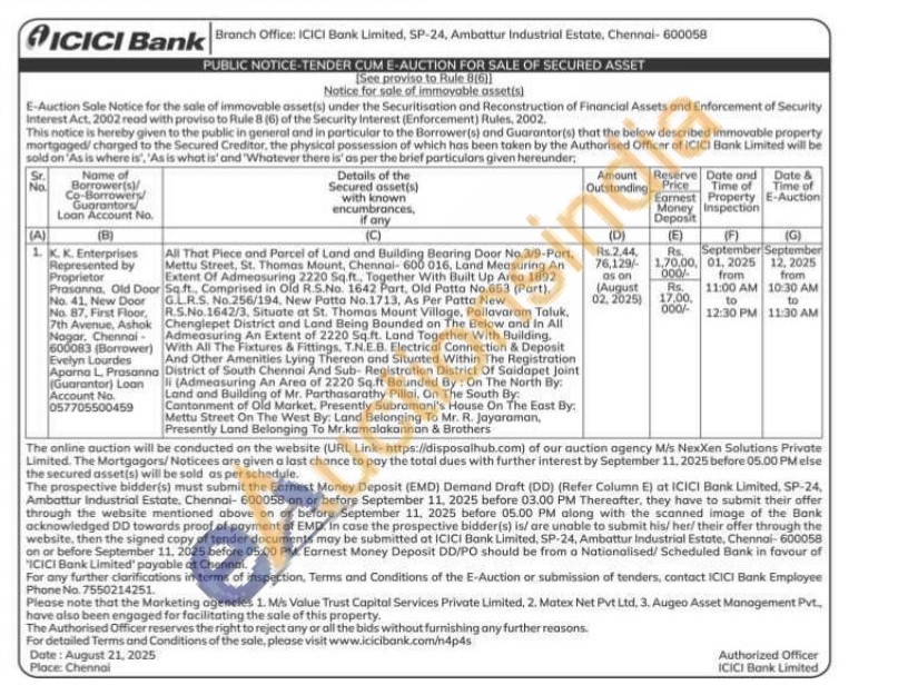 All That Piece and Parcel of Land and Building Bearing Door No.3/9-Port, Mettu Street, St. Thomas Mount, Chennai-600 016, Land Measuring An Extent Of Admeasuring 2220 Sq.ft., Together With Built Up Area 1892 Sq.ft., Comprised in Old R.S.No. 1642 Part. Old Patta No.653 (Part). GLR.S. No. 256/194, New Patta No.1713, As Per Patta New R.S.No.1642/3, Situate at St. Thomas Mount Village, Pallavaram Taluk. Chenglepet District and Land Being Bounded on The Below and in All Admeasuring An Extent of 2220 Sq.ft. Land Together With Building. With All The Fixtures & Fittings, T.N.E.B. Electrical Connection & Deposit And Other Amenities Lying Thereon and Situated Within The Registration District of South Chennai And Sub-Registration District Of Saidapet Joint li (Admeasuring An Area of 2220 Sq.ft Bounded By: On The North By: Land and Building of Mr. Parthasarathy Pillai, On The South By: Cantonment of Old Market, Presently Subramani's House On The East By: Mettu Street On The West By: Land Belonging To Mr. R. Jayaraman, Presently Land Belonging To Mr.kamalakannan & Brothers