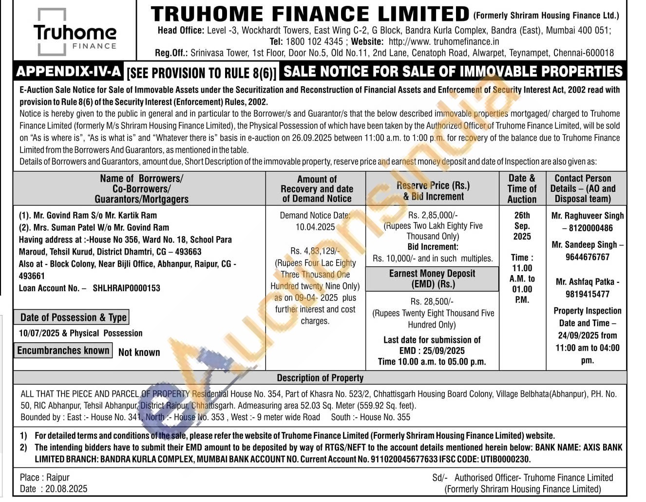 ALL THAT THE PIECE AND PARCEL OF PROPERTY Residential House No. 354, Part of Khasra No. 523/2, Chhattisgarh Housing Board Colony, Village Belbhata(Abhanpur), P.H. No. 50, RIC Abhanpur, Tehsil Abhanpur, District Raipur, Chhattisgarh. Admeasuring area 52.03 Sq. Meter (559.92 Sq. feet).