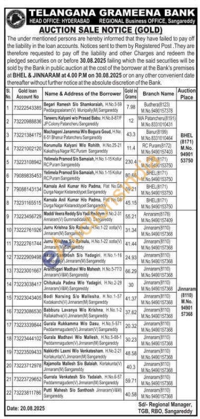 Telangana Grameena Bank Gold Auctions Auction in Hyderabad
