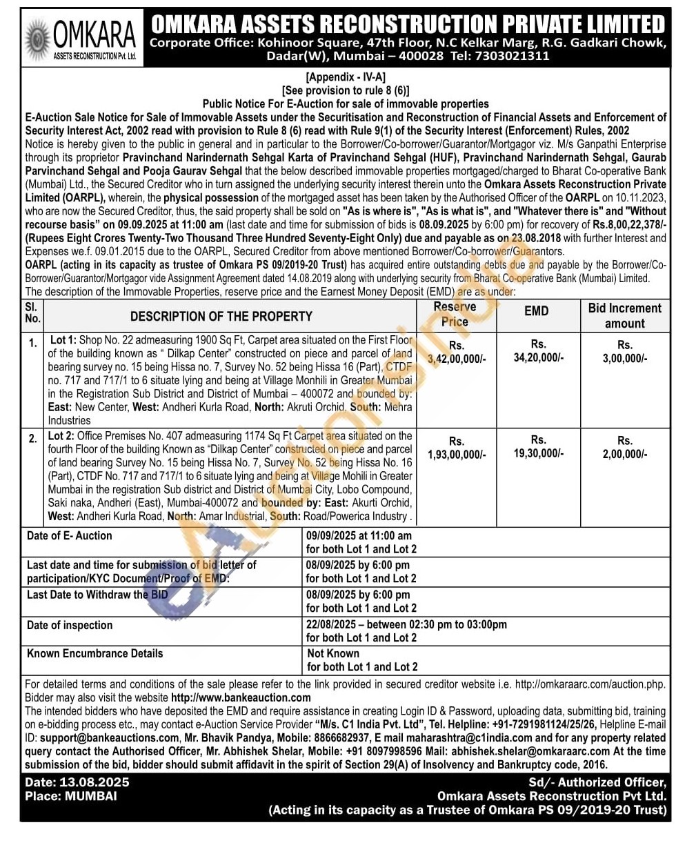 Contact the Authorised Officer, Mr. Abhishek Shelar, Mobile: +91 8097998596