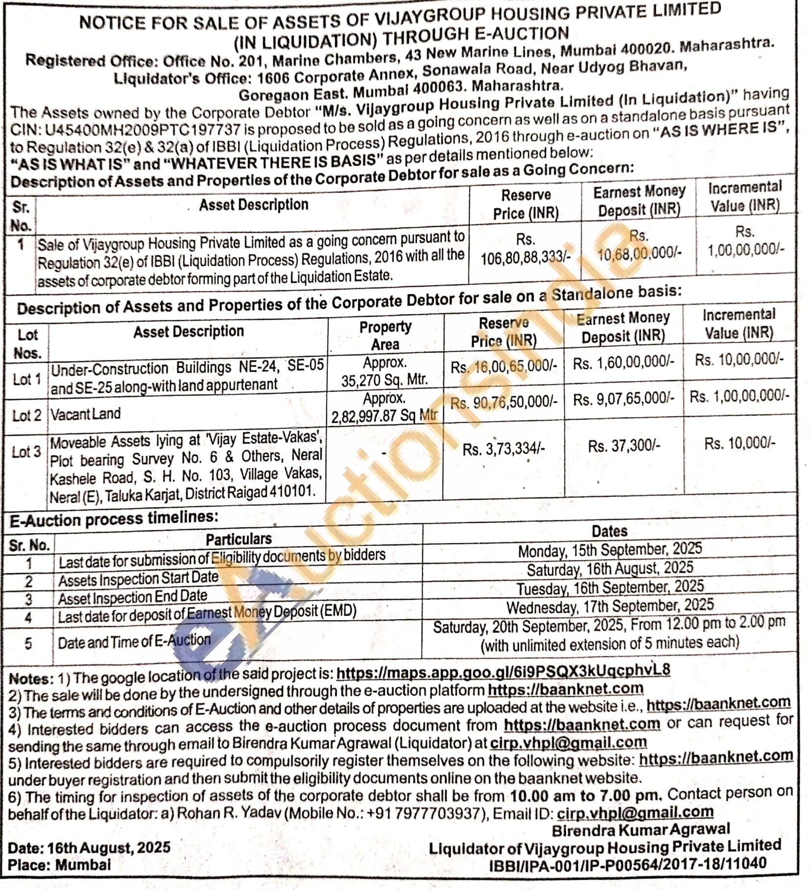 Sale of Vijaygroup Housing Private Limited as a going concern pursuant to Regulation 32(e) of IBBI (Liquidation Process) Regulations, 2016 with all the assets of corporate debtor forming part of the Liquidation Estate