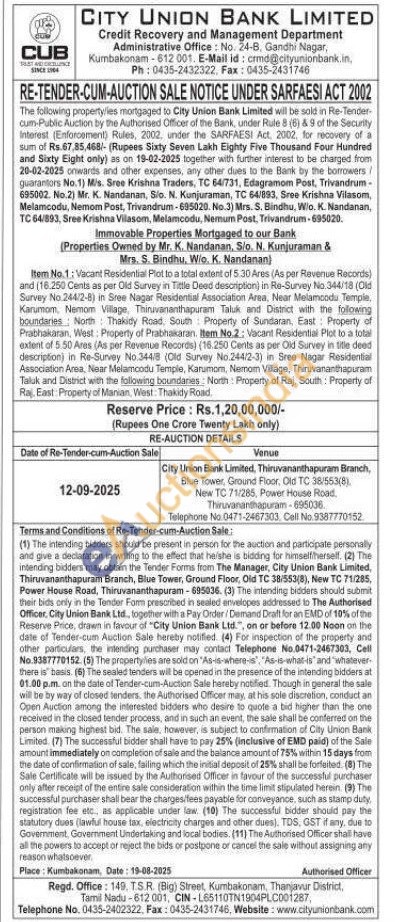 Item No.1: Vacant Residential Plot to a total extent of 5.30 Ares (As per Revenue Records) and (16.250 Cents as per Old Survey in Tittle Deed description) in Re-Survey No.344/18 (Old Survey No.244/2-8) in Sree Nagar Residential Association Area, Near Melamcodu Temple, Karumom, Nemom Village, Thiruvananthapuram Taluk and District with the following boundaries North Thakidy Road, South Property of Sundaran, East Property of Prabhakaran, West: Property of Prabhakaran. Item No.2: Vacant Residential Plot to a total extent of 5:50 Ares (As per Revenue Records) (16.250 Cents as per Old Survey in title deed description) in Re-Survey No.344/8 (Old Survey No.244/2-3) in Sree Nagar Residential Association Area, Near Melamoodu Temple, Karumom, Nemom Village, Thiruvananthapuram Taluk and District with the following boundaries: North Property of Raj, South: Property of Raj. East: Property of Manian, West: Thakidy Road