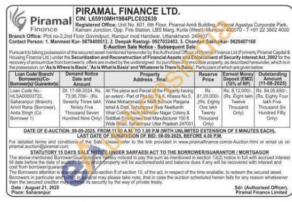 All The piece and Parcel of the Property having an extent:-Part of Plot No 5 & 6. Khasra No. 5. Wake Mohammadpur Malffi Bairoon Pargana lehsil & Distt, Saharanpur Near Neelkanth Vihar Colony Near Mahadev Nagar Colony & Siddball Enterprises Nail Manufacturer 100 ft Wide Road, Saharanpur Uttar Pradesh 247001