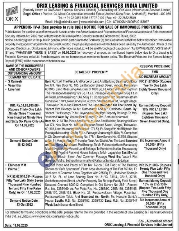All That Piece And Parcel of Flat No. T-2 on 3 Rd Floor, of The Building Known as "Safa Apartment", Plinth Area Measuring of The Flat 750 Sq. Ft. (Inclusive of Common Area), Together With 235 Sq. Ft. Undivided Share in 3115 Sq. Ft., of Land Bearing Door No. 31/13, 33/14, 35/15, 37/16, Sachithanandam Street, (As Per Property Tax Receipt Paddy Field Street) Kosapet, Chennai-600012, Comprised in Old Survey No: 2651, Present R.s. No. 2355/169, As Per Patta R.s. No. 2355/90, 2355/169, 2355/165, 2355/170, 2355/131, Block No. 37, Purasawakkam Village, Perambur-Purasawakkam Taluk, And Bounded As: North: Mr. Hussain Sahib's House South: R.S. No. 2355/102, 2355/130 East: R.S. No. 2355/147 West: Sachithanandam Street