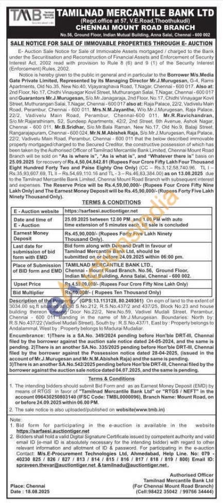 Description of the Property: (GPS: 13.113128, 80.249361) On eqm of land to the extent of 3034.00 sq.ft situated at Old S.No 212, R.S.No.437/2 and 437/25, Block No.23 and house building thereon bearing Door No. 22/2, New No.59, Vadivel Mudall Street, Perambur, Chennai 600 011 standing in the name of Mr.J Murugesan. Boundaries: North by R.S.No.437/22 (Vadivel Mudali Street), South by: R.S.No.437/1, East by: Property belongs to Andalammal, West by: Property belongs to Madurai Mudaliar,