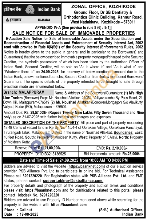 All piece and part of property measuring 18.48 Cents of vacant land in Re Sy No. 115/4-4 of Oorakam Village, Oorakkam Panchayat, Tirurangadi Taluk, Malappuram District in the name of Noushad Allakkat. Boundaries: East: 10 feet Road, South: Property of Mioideen Kutty, West: Property of K Alavi, North: Property of Moideen Kutty.